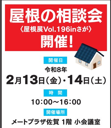 topページ>>新着・更新情報>>【2/13㈮・14㈯開催】佐賀の住まいを守って70年。「屋根の相談会」で住まいの不安を解消しませんか?